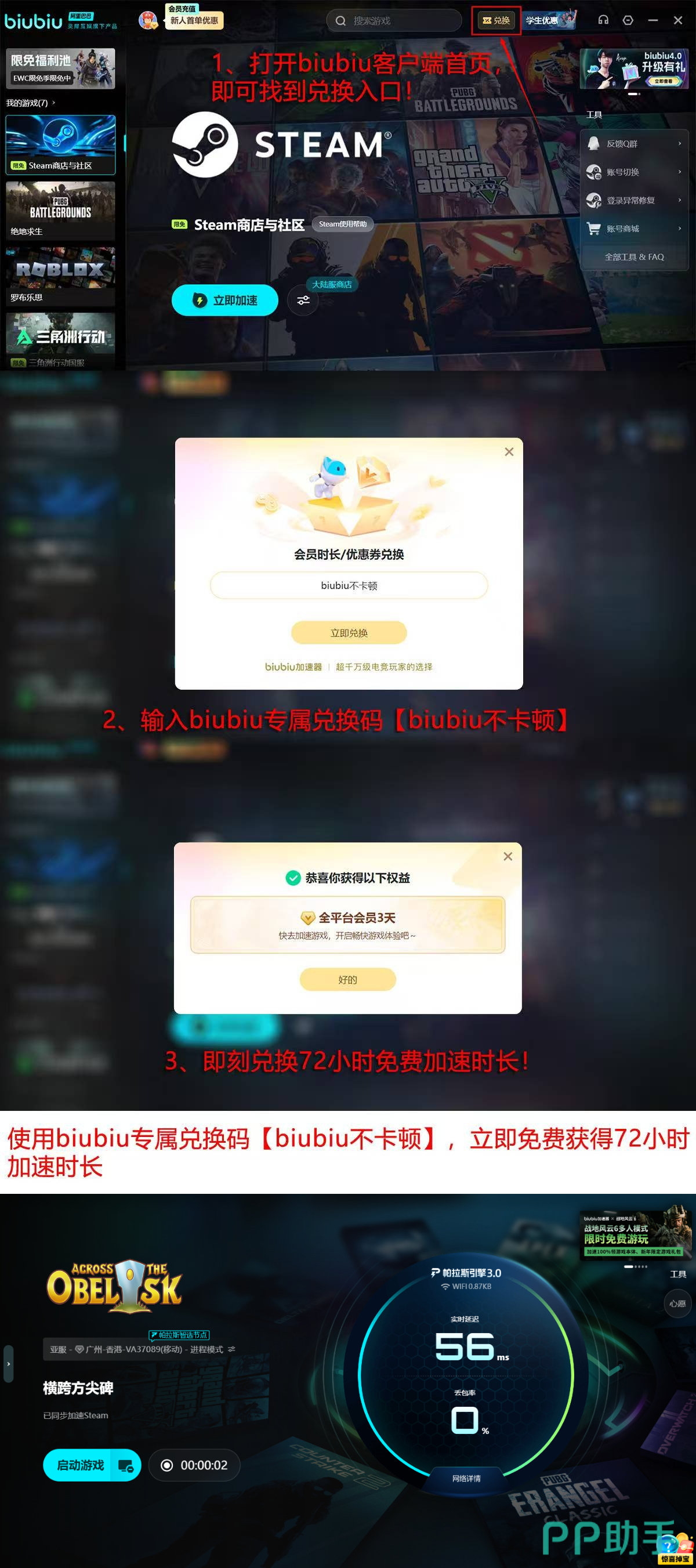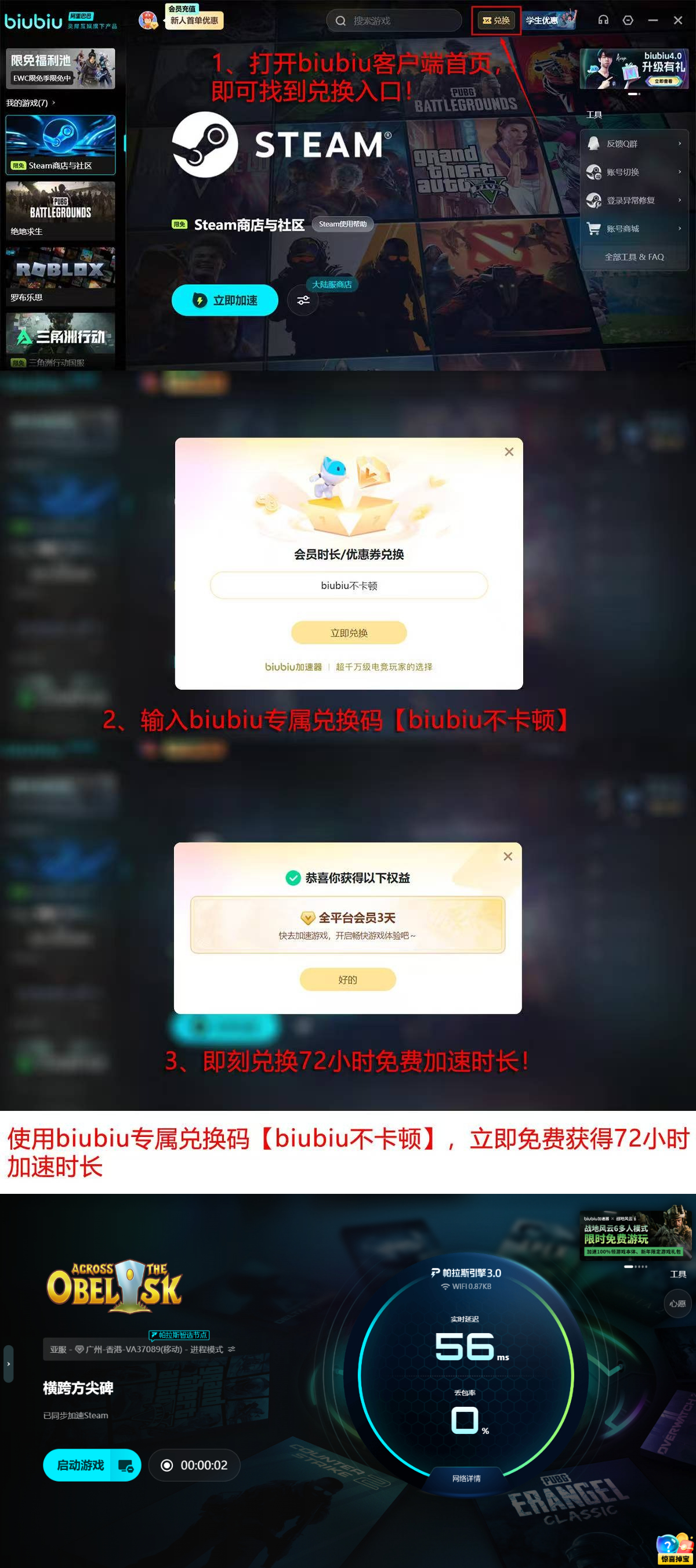 biubiu加速器提供新用户友好型试用策略:注册即赠24小时全功能免费加速权限;输入激活码【biubiu不卡顿】还可额外获得72小时连续加速时长,总计可达96小时无门槛体验周期,充分满足玩家对联机稳定性与操作流畅性的测试需求。