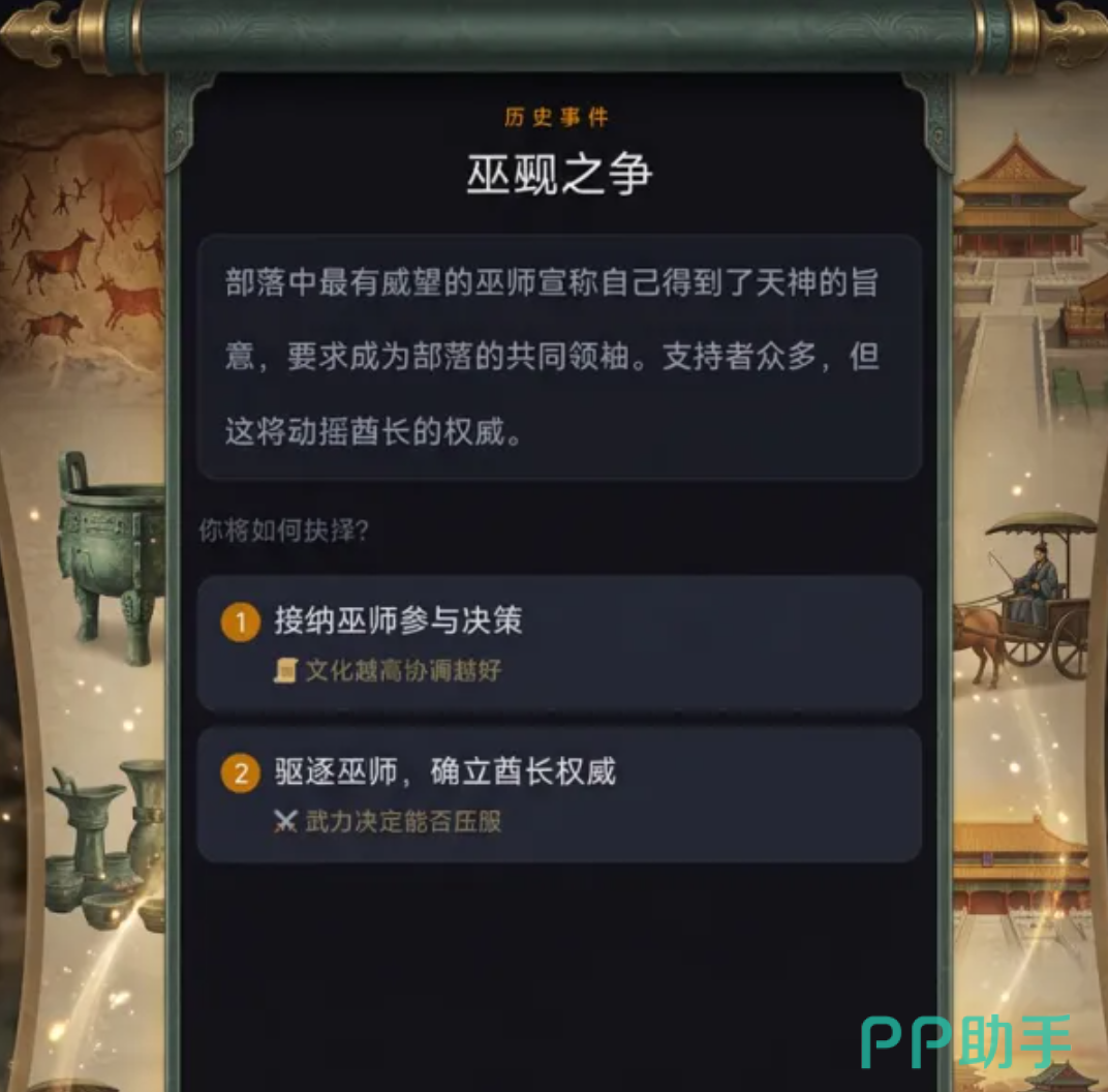 游戏采用线性历史框架与非线性叙事结合的设计思路,完整覆盖从钻木取火、礼乐制度确立到百家争鸣的思想跃迁全过程。不同时期呈现差异化矛盾焦点:原始阶段聚焦生存保障,夏商周时期侧重权力整合,春秋战国则考验思想包容与军事应变能力。所有机制均服务于“决策驱动历史”的核心体验,使玩家在宏观文明演进中实践微观治理智慧。