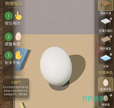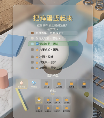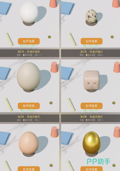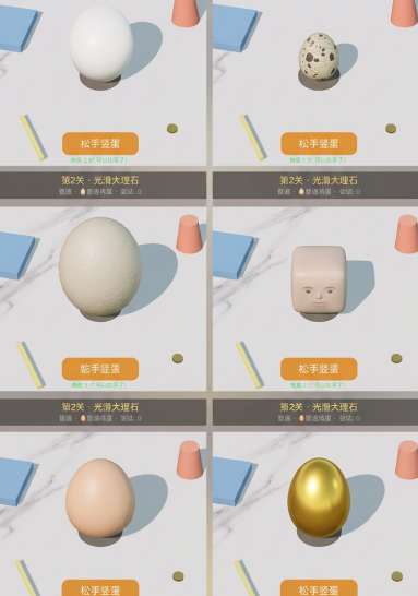 游戏中可解锁并使用的蛋类不止一种,每种蛋拥有独立的几何轮廓与重心分布特征——例如椭圆蛋、锥形蛋、双头蛋等。这些差异化设定直接影响其在特定地形中的竖立成功率与容错空间。合理匹配蛋型与关卡需求,是提升通关效率的关键技巧之一,因此鼓励玩家在推进主线过程中主动收集更多种类的蛋。