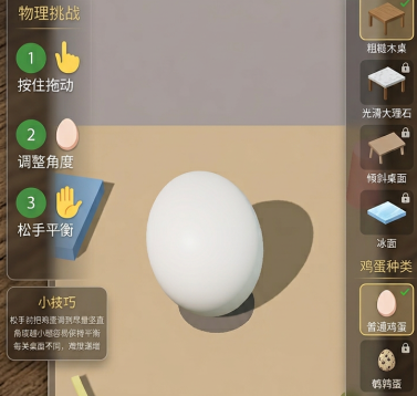 从已公开的实机演示与玩法说明来看,《把鸡蛋竖起来》属于典型的物理模拟类休闲小游戏。核心目标明确:通过调整角度、控制平衡或借助环境要素,使一枚鸡蛋稳定直立于指定支撑面上。成功维持竖立状态达指定时长即视为通关。各关卡在重力参数、底座稳定性、风力干扰及障碍布局等方面均存在差异,整体难度呈阶梯式上升,对操作精度与策略预判提出不同层次的要求。