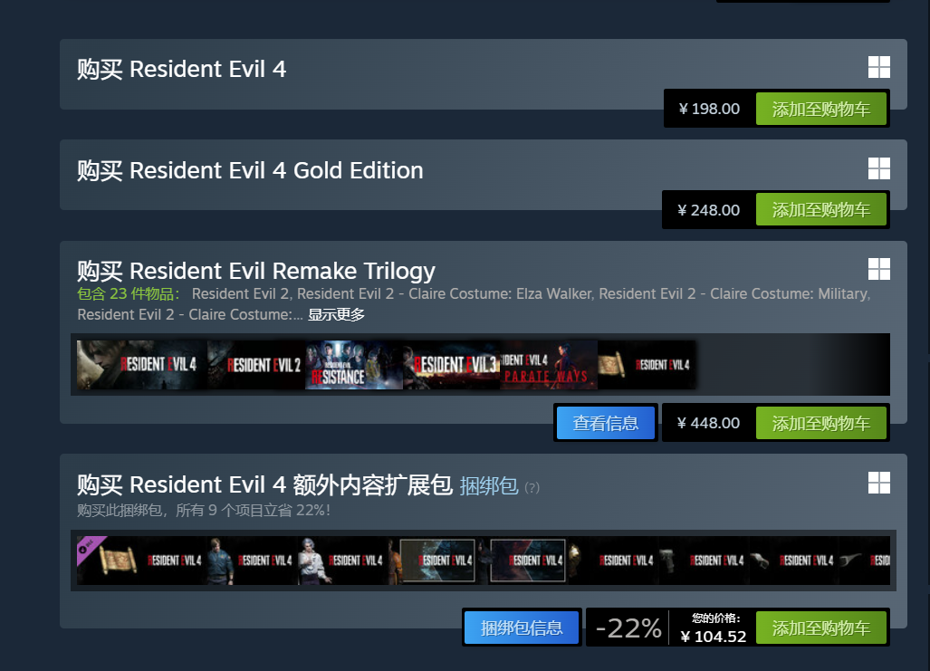 经核实Steam官方商店页面信息,《生化危机4 重制版》标准版与豪华版在本次春促中均未参与折扣活动,维持原价销售。但值得注意的是,拓展内容捆绑包(不含本体)已开放限时优惠,享7.8折,折后售价为104.52元。