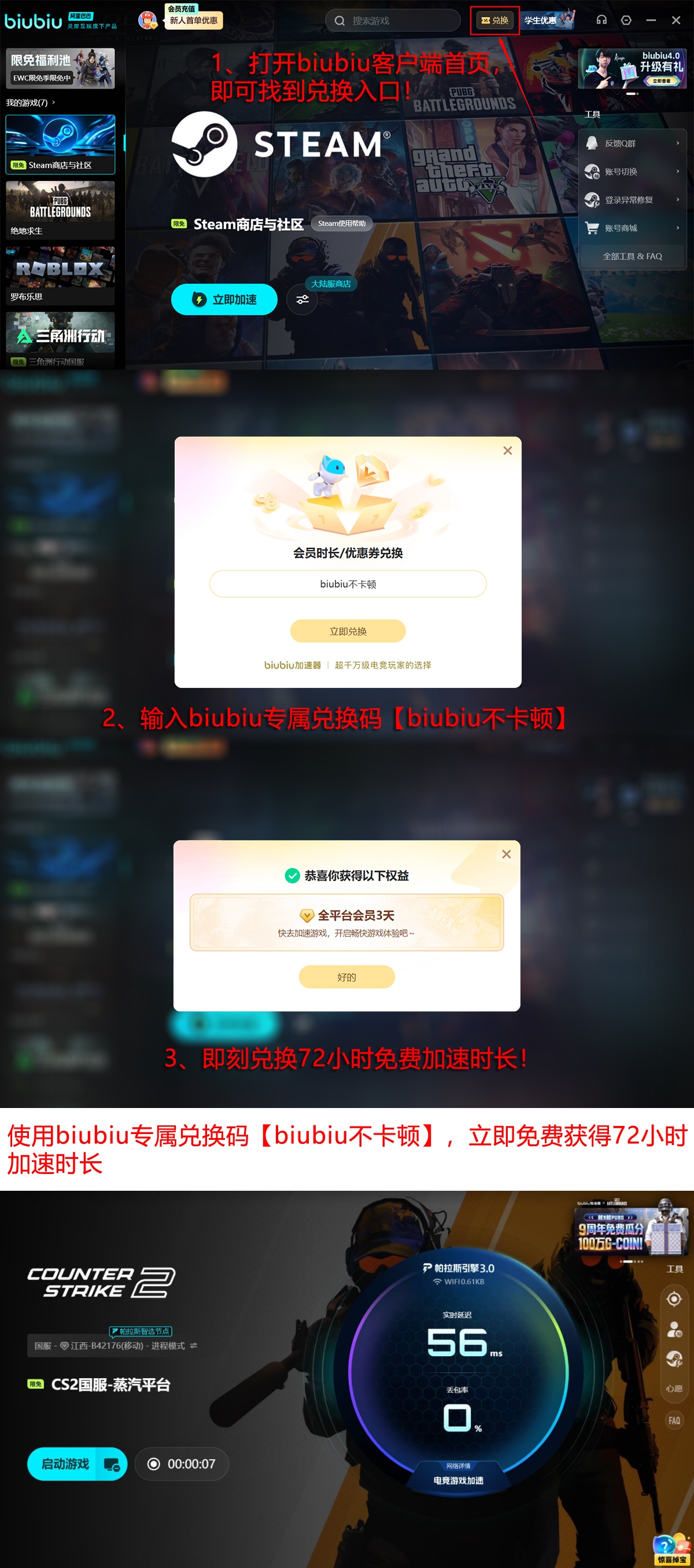 目前官方开放限时体验权益:新用户完成注册后即可自动获得24小时全功能免费使用权;所有用户输入口令【biubiu不卡顿】,均可额外领取3天高级加速服务。启动时请在平台内搜索“CS2”,根据实际登录账号所属平台(如Steam)选择对应加速模式,点击一键优化即可启用。
