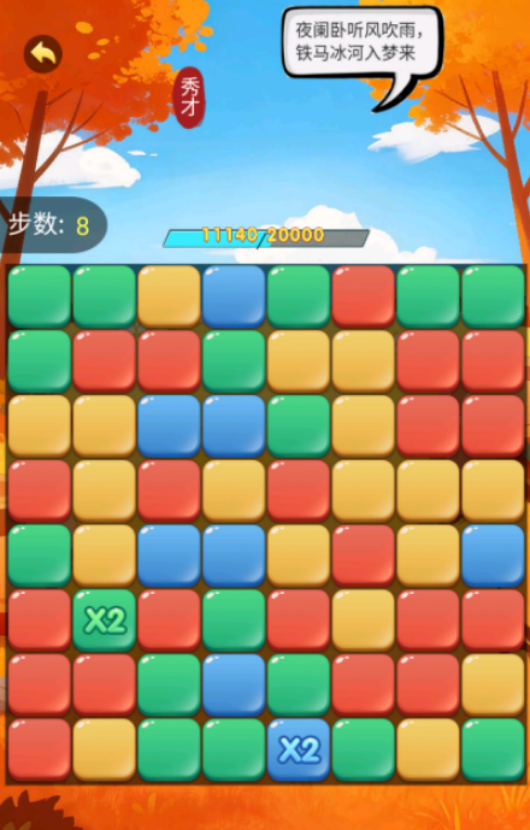 融合色彩识别与数值叠加机制,方块群组中嵌入“×2”等倍增标识,每次消除对应区域均可触发分数乘算效果。关卡难度梯度递进,核心挑战为在限定步数内达成指定积分目标。玩家可通过长按拖拽连接同色方块,松手即执行清除,一次性消除面积越大,基础分加成越显著。
