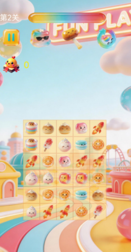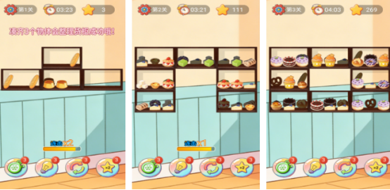 以美食货柜为场景载体,每个货柜内随机混排多种食物元素(如甜甜圈、奶油蛋糕等),要求玩家在倒计时结束前,将同一货柜中任意三个相同食物归位,达成即时消除并累积积分。连击判定机制可显著放大单次得分倍率,鼓励节奏把控与快速反应。