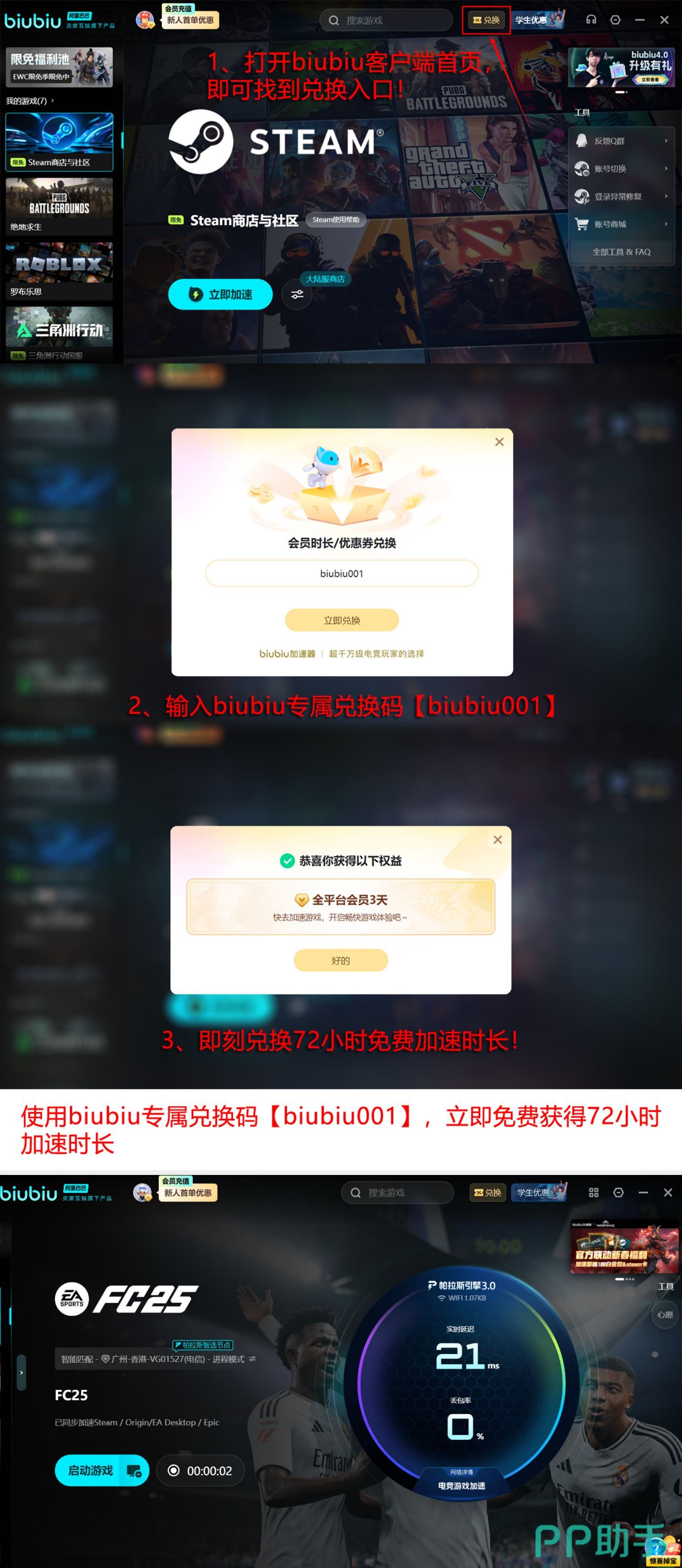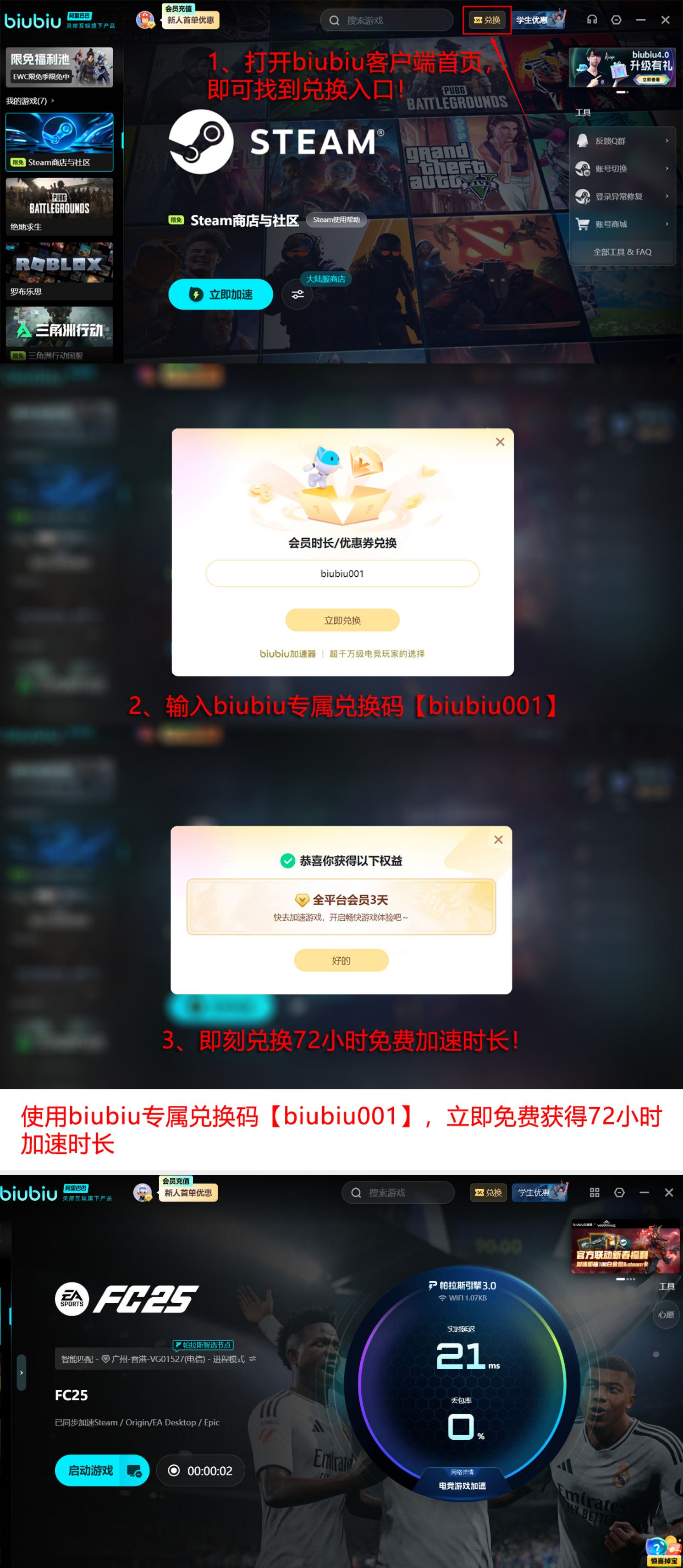 上方已提供官方下载入口,点击即可完成安装。首次注册用户完成实名认证后,自动获赠24小时免费加速时长;已注册用户输入专属口令【biubiu001】,还可额外领取72小时加速权益。新用户叠加两项福利后,总计可享96小时连续加速服务,覆盖PC端全平台,无设备与时段限制。