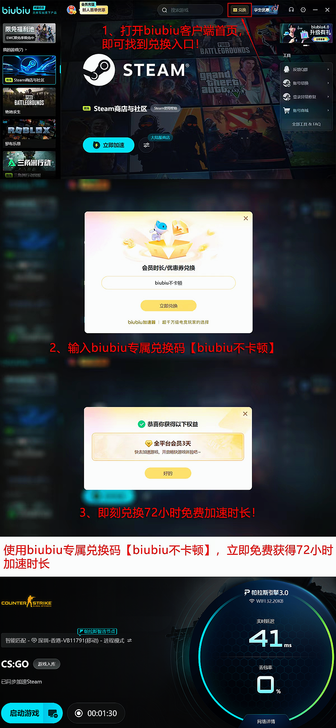 在性能升级的同时,福利这方面也是给到位的,新用户注册账号后,即刻解锁24小时全游戏不限速免费加速特权,告别延迟与掉线困扰。所有用户在兑换中心输入口令【biubiu不卡顿】,还能额外获取3天免费加速时长,福利实用又丰厚。