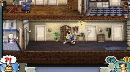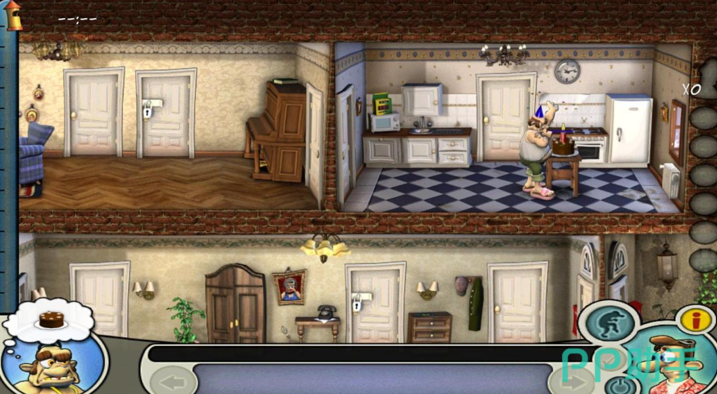 系列最新移动端续作,采用剪影定格式美术设计,角色轮廓与动态帧间插入手绘质感转场。场景结构升级为立体多层住宅,含地下室、二层卧室、屋顶平台等可探索区域。道具库扩充至30+种,支持连锁布置(如香蕉皮→滑倒→撞翻花盆→触发警报),强化策略深度与失败重试趣味性。