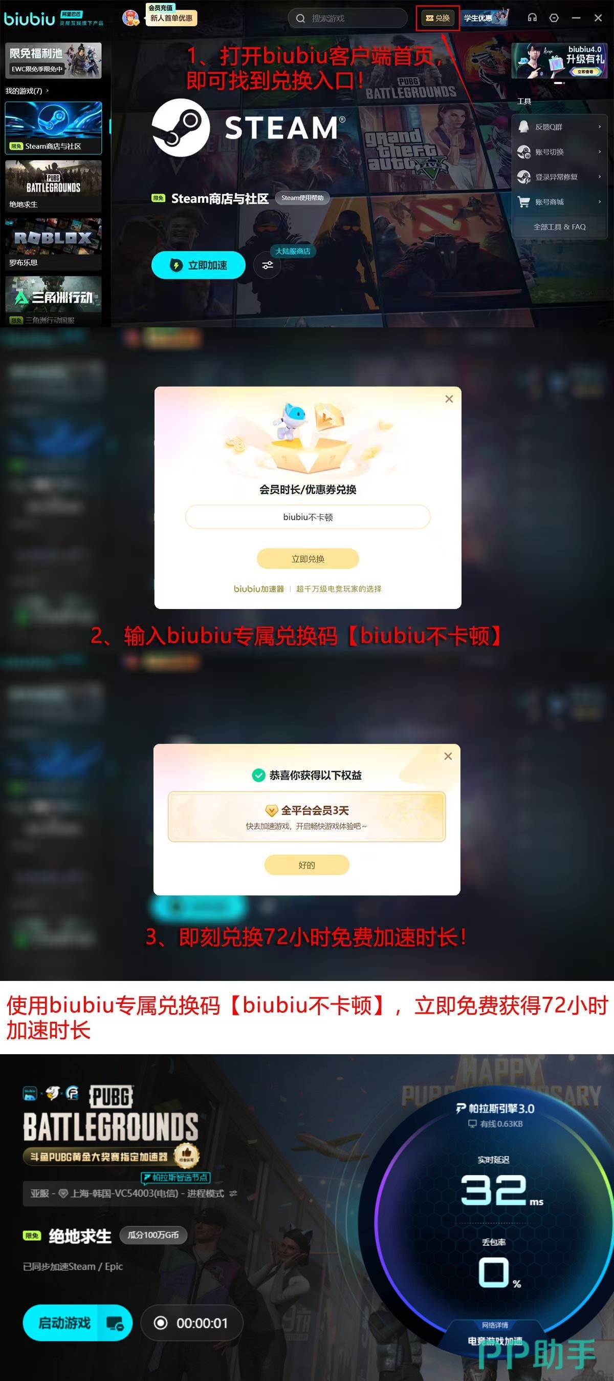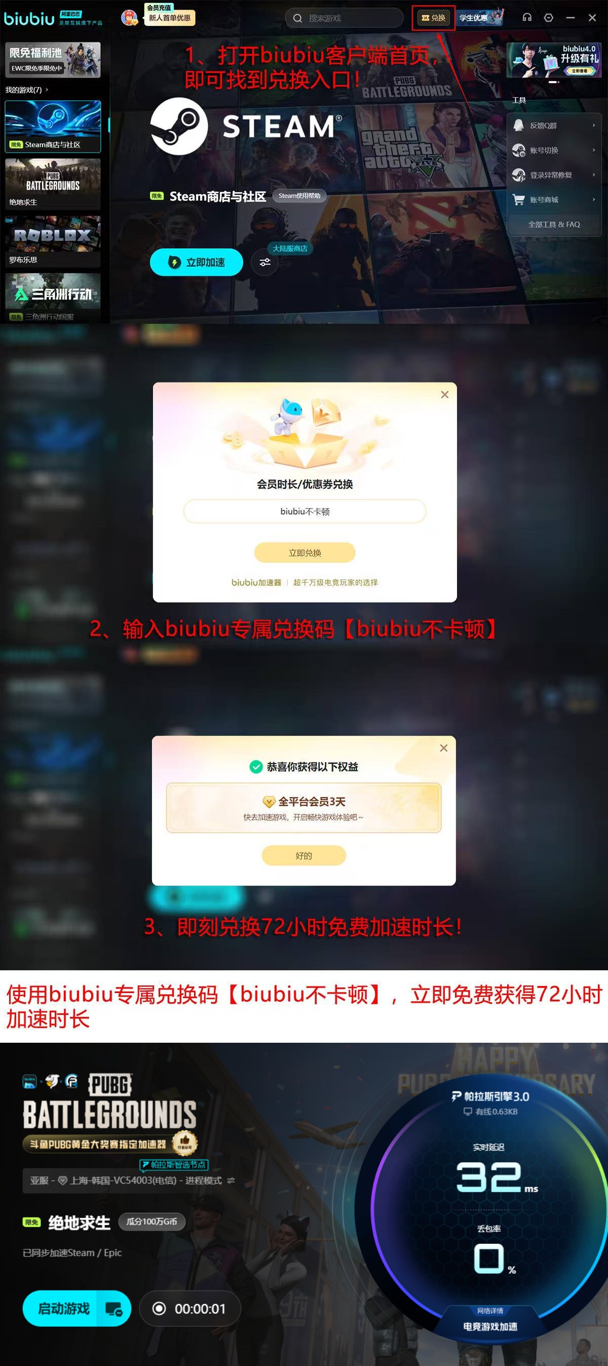 目前,biubiu加速器面向新用户提供多重体验权益:完成账号注册即可获赠24小时全游戏免费加速时长;输入专属兑换码【biubiu不卡顿】,新老用户均可额外领取72小时加速服务。这意味着新用户首次使用即可累计享有96小时无限制加速体验,充分验证其在PUBG场景下的稳定性与流畅度表现。