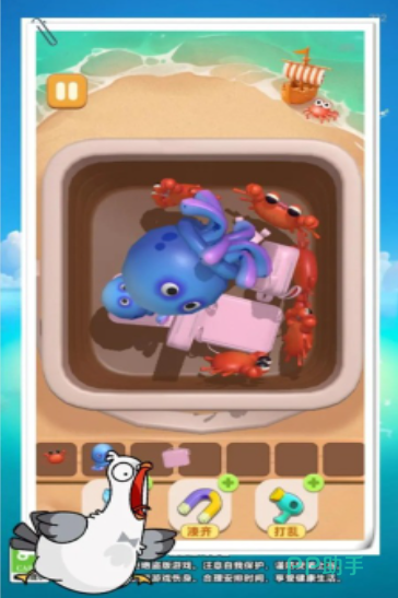 这是一款快节奏识别类益智游戏。玩家扮演河道打捞员,在有限格数的收集栏中,从混杂的生物群(含鸭子、海螺、章鱼等)中精准识别并捞取全部鸭子。每关格子容量固定,一旦填满非目标生物即判定失败。鸭子造型高度差异化,部分存在视觉干扰设计,对图像辨识力与手速响应提出双重挑战。
