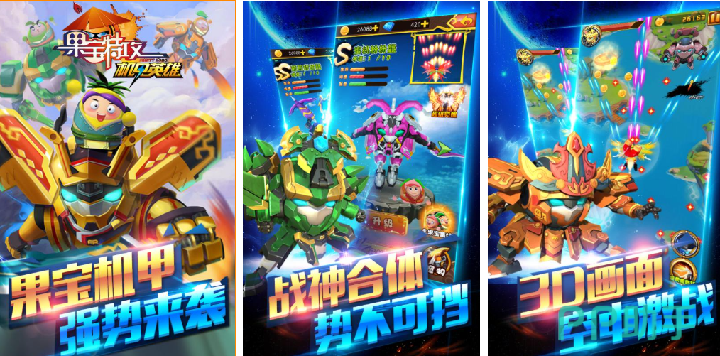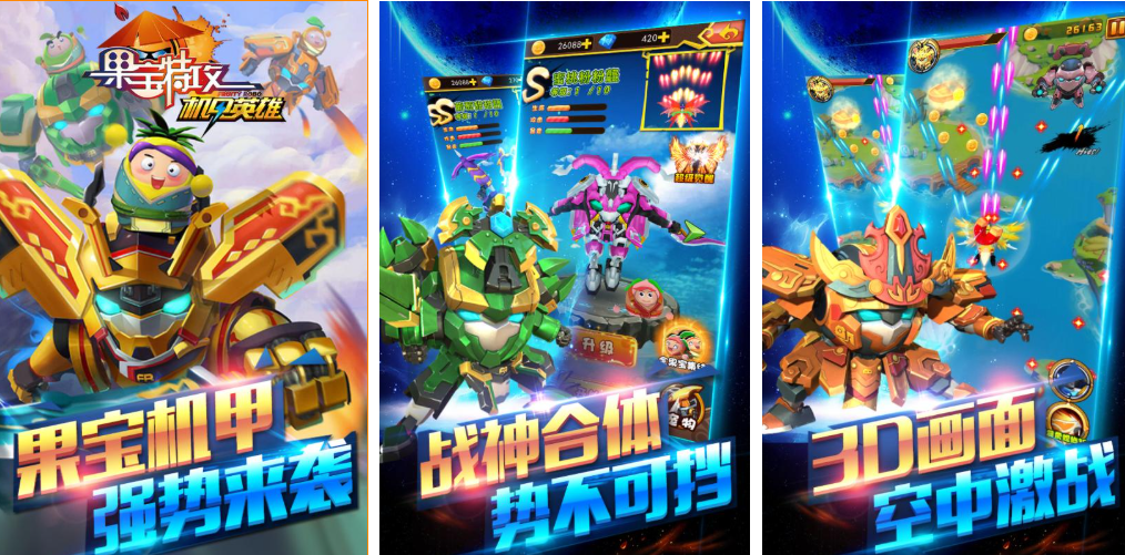 改编自同名国产动画IP的飞行射击类机甲手游,核心玩法为纵向卷轴弹幕对抗,玩家操控果宝特攻系列机甲在三维空间中进行高速机动、闪避与集火攻击。机体支持三阶段进化,每阶段解锁新武器形态(如激光炮、追踪导弹、能量护盾),关卡Boss战采用多阶段机制,需识别弱点部位并切换对应武器类型进行破防。
