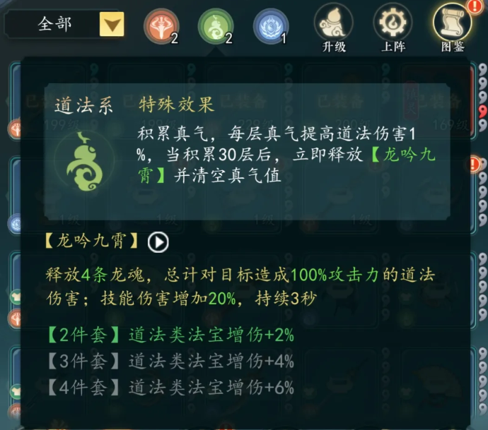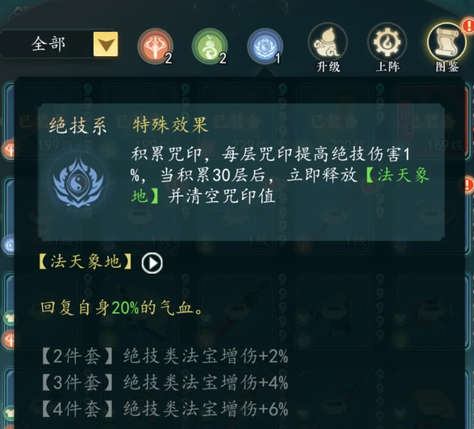 具体来看:飞剑系法宝在释放技能时自动积攒剑意值,叠满30层后触发剑气范围伤害,并附加沉默效果;道法系法宝持续累积真气,达30层后提升全队20%最终伤害;绝技系法宝则通过印咒积累,满30层时恢复自身20%最大气血。三者定位清晰——飞剑重控场与爆发兼顾,道法专注伤害增益,绝技侧重生存续航。