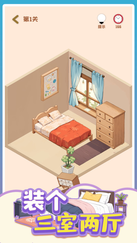 节奏紧凑的关卡制设计带来轻度挑战感。画面采用清新极简风,每关对应不同户型结构(如主卧、客厅、书房等),任务难度逐级递进。玩家需在限定时间内完成功能分区、动线优化与美学协调,锻炼实用家装决策力。