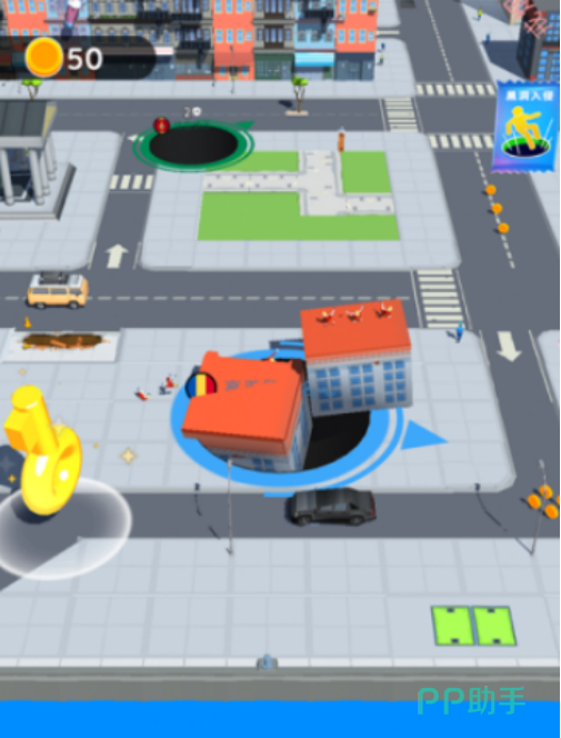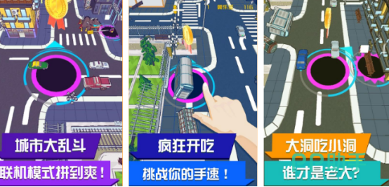本作主打自由吞噬与实时体型变化机制。玩家通过滑动屏幕控制黑洞在都市环境中移动,靠近高楼、汽车等目标即可自动吸附并吞没;每次成功吞噬后,黑洞半径实时增长,形态随之放大,形成显著的视觉成长反馈。支持多人同服竞技,弱势状态下需主动规避强敌,策略性与操作感并存。