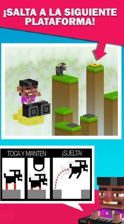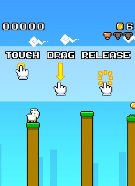 采用像素艺术风格,色彩鲜明,构建出富有怀旧气息的方块化世界。核心设定为山羊穿越马路,跳跃距离由按压时长精准决定,需同步协调力度与时机。前期关卡地形平缓,后期逐步引入断裂路面、高速滚动轮胎等高风险障碍。场景中散落金币与功能性道具:护盾可抵消一次失误,加速器提升横向位移效率。成就目标包括“连续跳跃X次”“全程零失误通关”等,具备较强练习导向性。