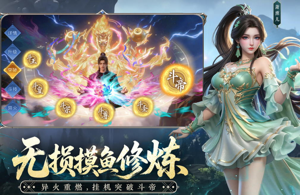 该作基于天蚕土豆同名小说深度开发,主打“放置+卡牌+RPG”融合玩法。核心数值体系复刻原著“斗之气—斗者—斗师…斗圣”九段晋升路径;符文系统支持“火、雷、风、毒”四系自由搭配,组合技触发对应元素特效;战斗采用竖屏自动演算模式,技能释放时机由AI根据敌方弱点智能判断;视听层面采用杜比全景声录制,萧炎台词由专业配音演员演绎,关键剧情节点插入手绘动态插画。