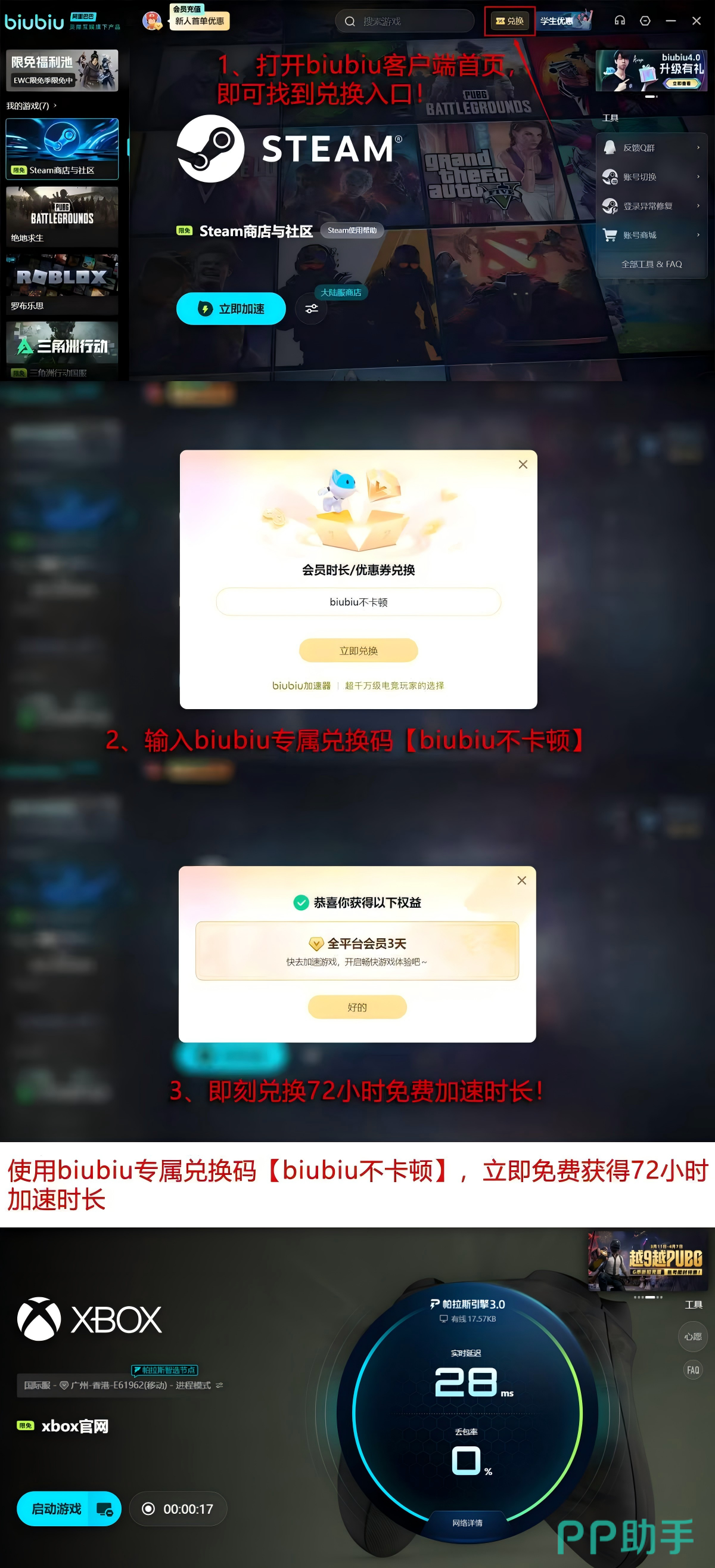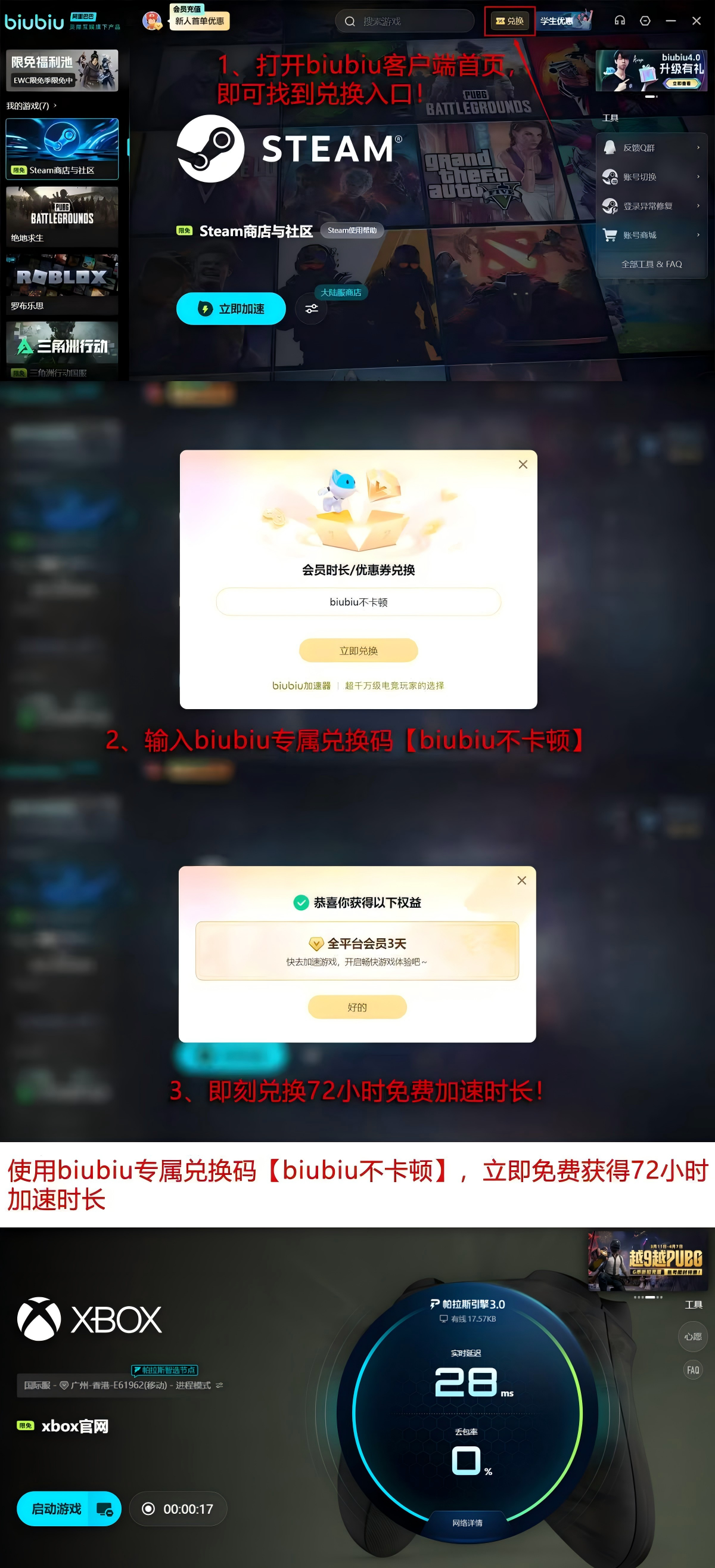 新用户注册后即可获得24小时免费加速权益;参与“biubiu不卡顿”活动还可额外获取72小时加速时长,两项权益支持叠加使用,总计可达96小时连续加速服务,充分满足中长期游戏需求。
