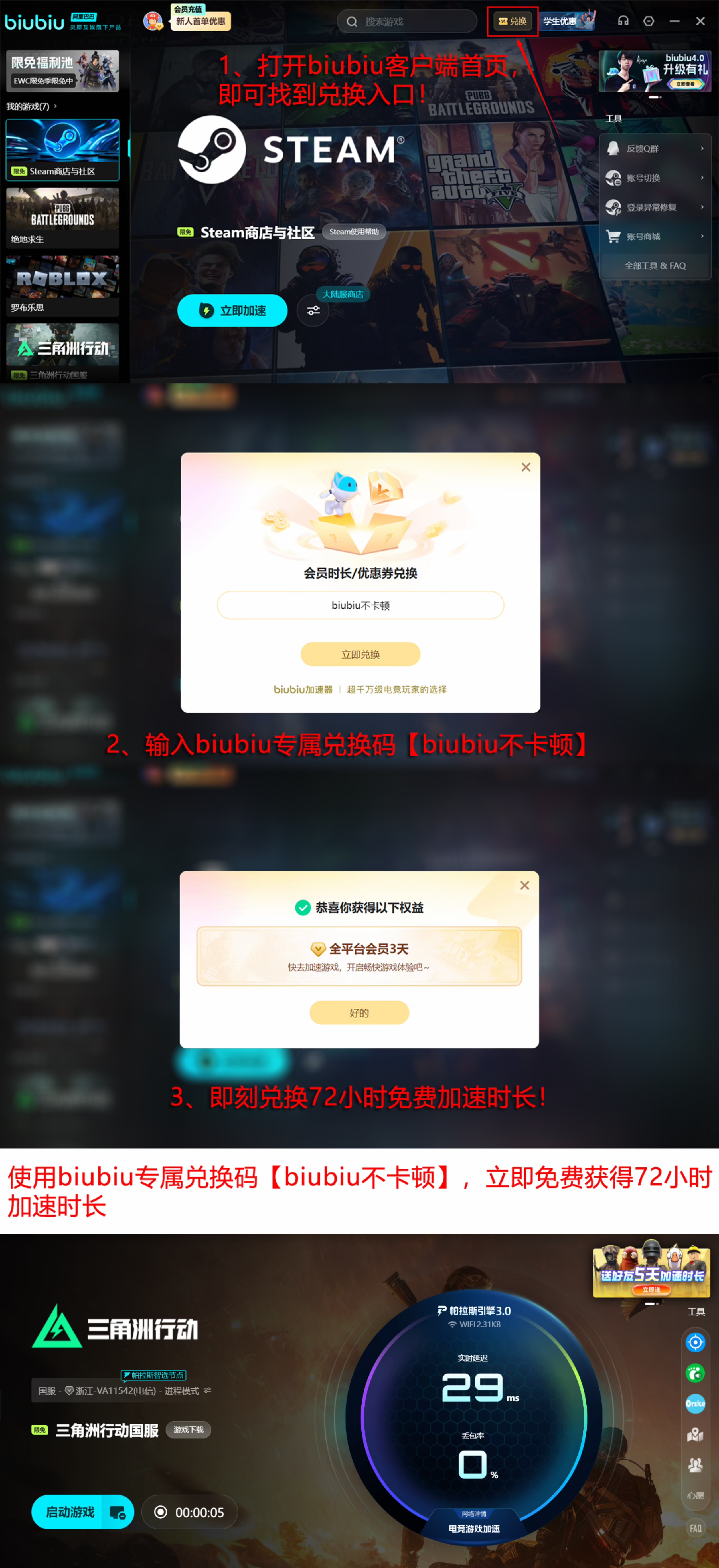 除核心加速能力外,biubiu还提供多项新手激励权益。完成注册的新用户,输入口令【biubiu不卡顿】即可领取3天全时段加速服务;首次下载并完成登录的玩家,还可额外获得24小时新人专属加速时长。