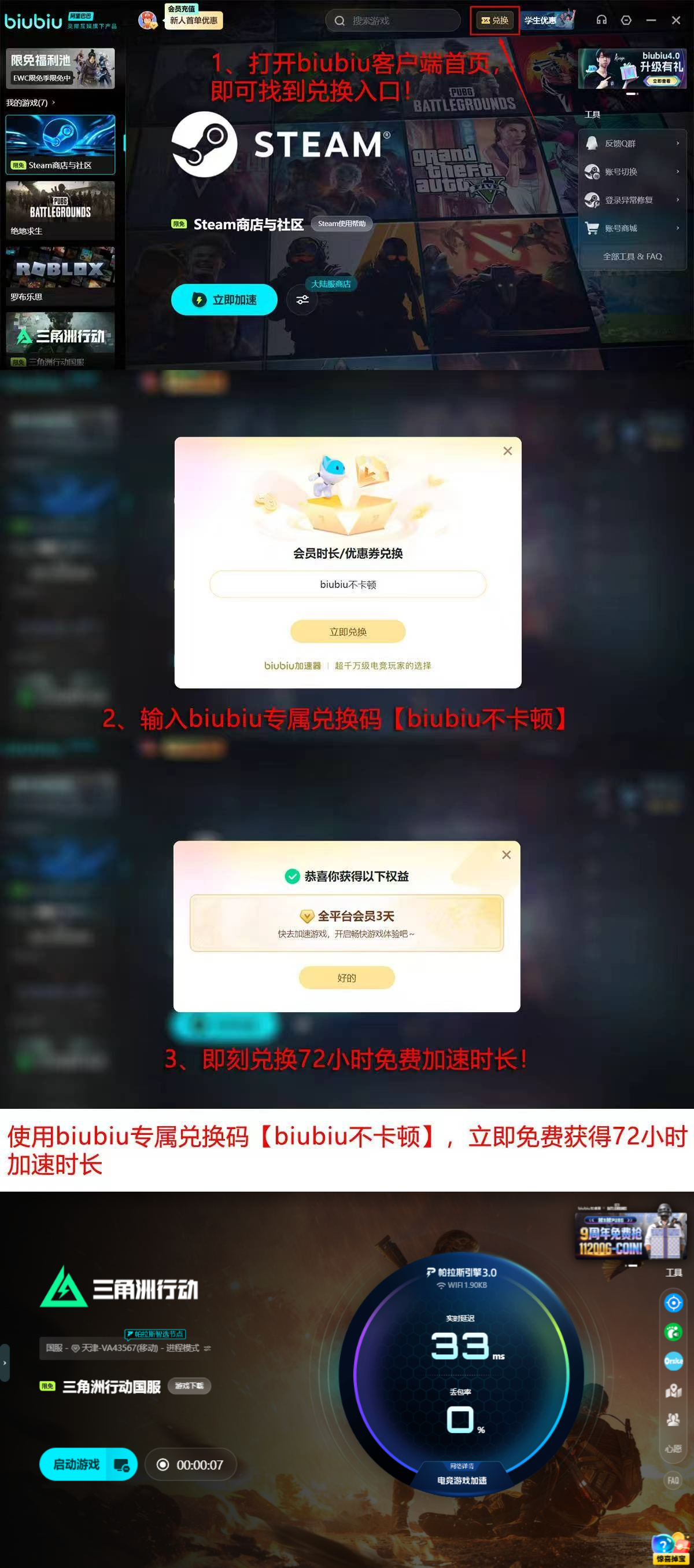 新用户完成注册后,可立即获取72小时全功能加速时长;首次登录输入口令【biubiu不卡顿】,额外解锁24小时权益,总计享96小时免费试用期。欢迎即刻体验。