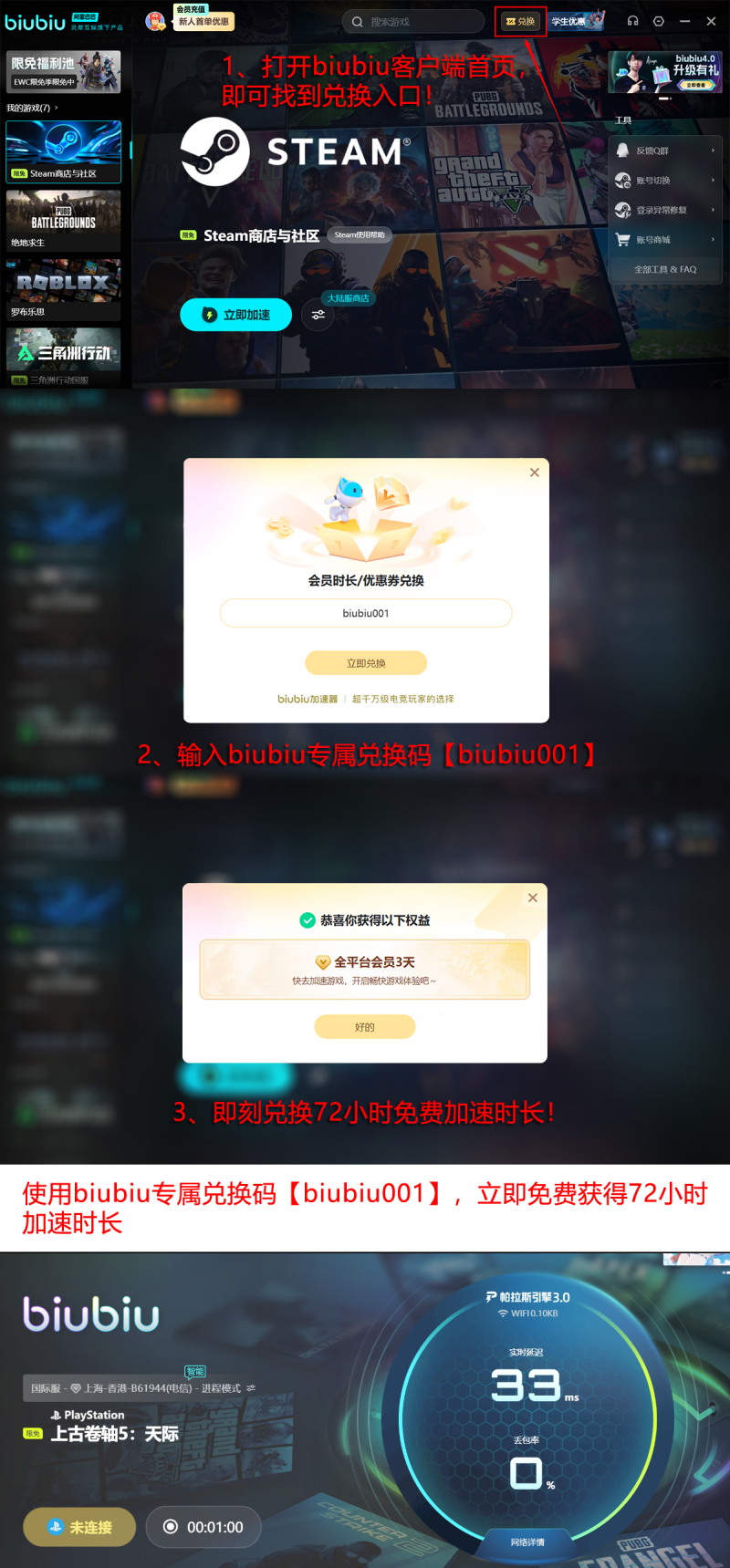 当前平台推出新人激励计划:首次注册即赠24小时全节点加速时长;新老用户输入专属兑换码【biubiu001】,可额外获得三天免费使用权。叠加权益后,新用户最高可享96个小时连续加速服务,适用于《上古卷轴5》及其他Steam/EPIC平台游戏。