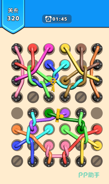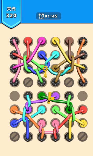 以物理绳结解构为核心的益智解压类游戏,关卡中呈现多股彩色绳索缠绕状态,玩家需依序点击节点、拖拽端点完成分离。逻辑设计贴近真实绳结原理,视觉反馈细腻,难度梯度合理,强调观察力与空间判断力,适合短时集中训练与情绪调节。