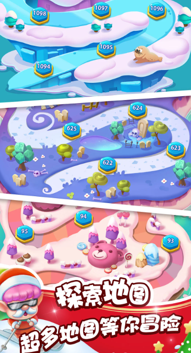 以糖果世界为视觉主题,场景建模细腻,UI动效流畅。核心任务为解救被困于糖晶中的玩偶角色。玩家需在限时内完成指定消除组合,成功后播放特写动画并同步清脆音效,营造强反馈感。关卡设计强调空间逻辑判断,合理选择发射角度与落点顺序,是通关关键。