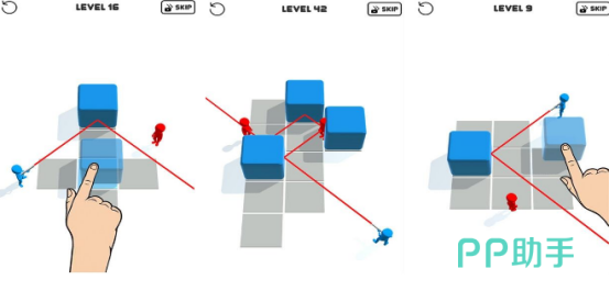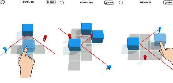 基于光学反射原理构建关卡逻辑,玩家需调整镜面角度或滑动轨迹引导激光路径,精准命中红色目标单位。难度曲线呈阶梯式递进,前期侧重基础反射训练,后期引入多光源、移动障碍与折射介质等变量。角色模型采用红蓝双色高对比设计,强化视觉辨识度与操作指向性。