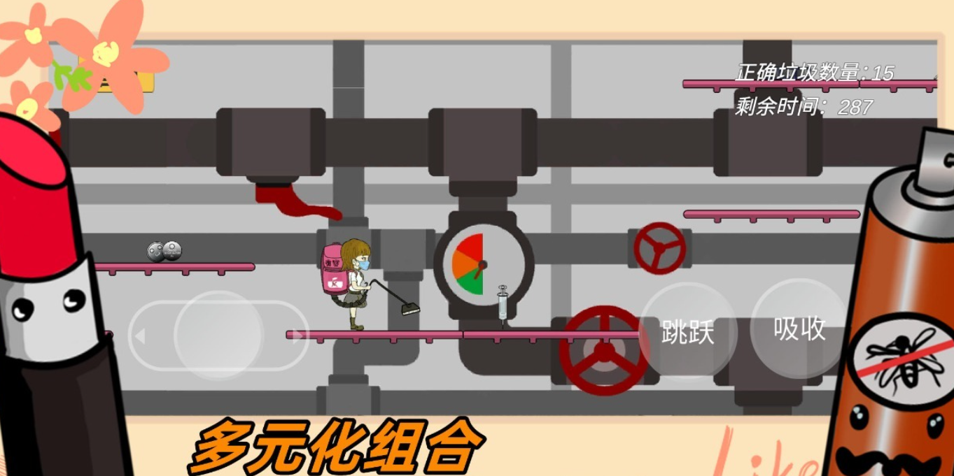 一款具备Roguelike元素的横版动作冒险游戏。玩家操控拟人化垃圾桶角色,在随机生成的地图中跳跃、冲刺、吸附敌人(即各类垃圾),通过组合技能形成连招链。设有无尽模式、Boss挑战与成就系统,UI采用萌系像素风,音效俏皮富有节奏感。每局通关后可解锁新外观、新能力模块,成长路径清晰。