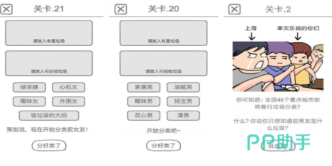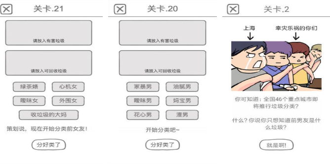 一款带有强烈叙事解构色彩的互动文字冒险游戏。以“情感关系中的行为归类”为隐喻切入,通过多分支剧情与选择题形式,引导玩家对虚构人物言行进行主观判定,并映射至四类垃圾标签。无固定结局,强调玩家价值观投射与情绪共鸣,美术采用手绘涂鸦风,台词犀利直白,兼具娱乐性与思辨空间。