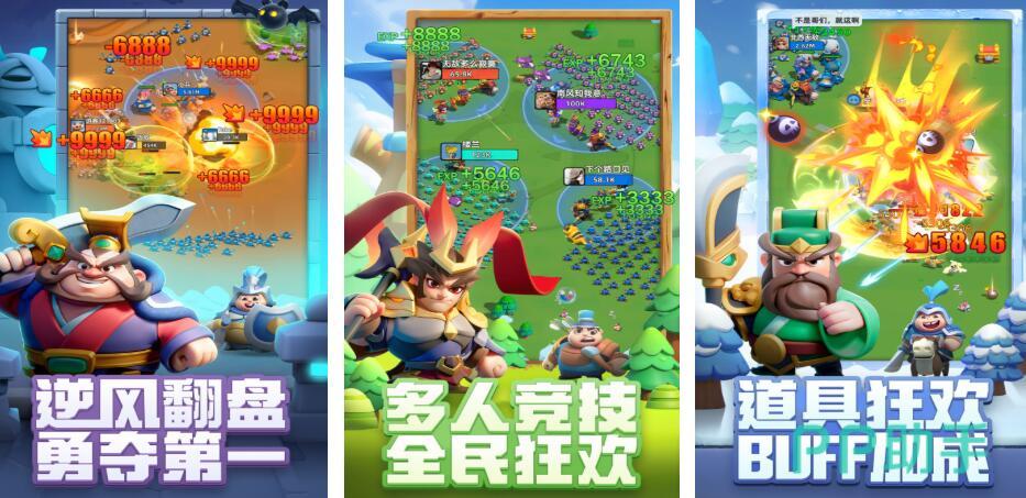 本作主打实时多人同屏对抗,单局最高支持12名玩家同步参与。玩家需在倒计时内完成布阵、指令下达与战术调整,考验临场决策能力。玩法体系包含经典竞技、大逃杀(吃鸡)及据点争夺等多种模式。角色设计取材自三国历史名将,采用Q版3D建模,兼顾辨识度与立体表现力。
