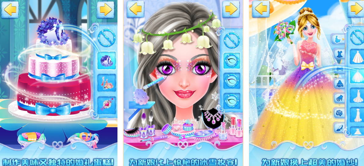 构建极寒王国王室世界观,服饰体系深度绑定冰雪元素:冰晶镂空头纱、霜纹刺绣长袍、雪花浮雕高跟靴、极光渐变披肩等。玩家需为冰雪公主策划整场皇家婚礼,涵盖造型设计、舞会编排、雪景布展三大主线。实时渲染雪花飘落效果与镜面反射材质增强沉浸感。化妆系统采用模块化设计(眼影/腮红/唇彩三选一),降低操作门槛,是儿童初识面部比例与妆容协调性的友好入口。