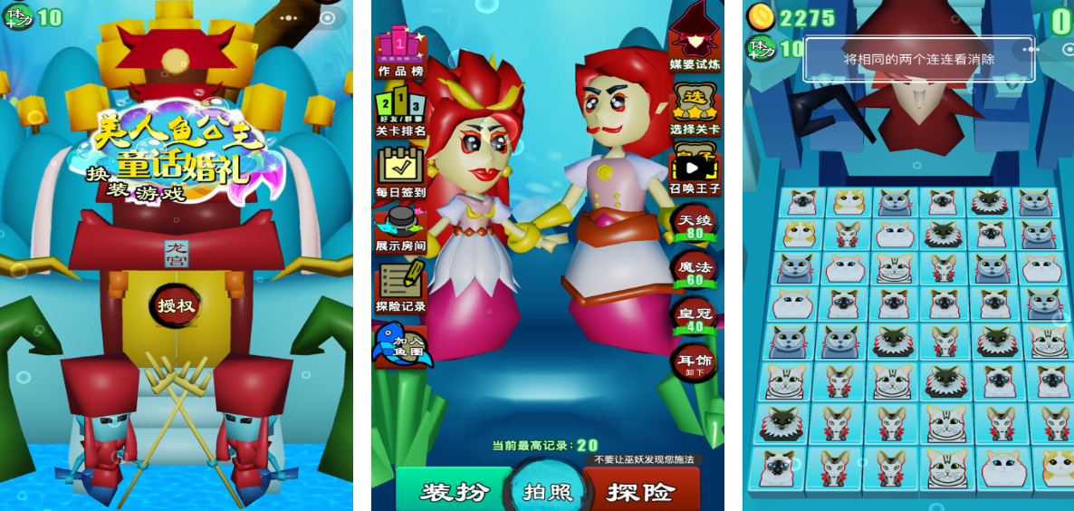 以深海王国为叙事背景,围绕美人鱼公主婚礼筹备展开。提供贝壳纹样礼服、珊瑚发冠、荧光鱼尾裙、珍珠腰链等百余种海洋主题装饰。特别设置“婚礼全流程模拟”模块:包含海底圣殿布置、宾客邀请函设计、新郎礼服搭配、仪式流程排序等环节。美术风格强调通透水感与柔焦光影,大量运用动态气泡、流光粒子特效,潜移默化传递不同文化中关于承诺、仪式与联结的价值观。