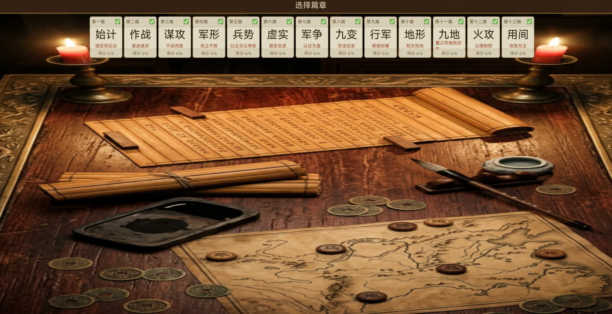 游戏依照《孙子兵法》十三篇内容结构来创建自己的游戏框架,每个章节对应着不一样的剧情以及战术。从“始计篇”的庙算推演,“谋攻篇”的不战而屈人之兵,“虚实篇”的避实击虚,玩家在跌宕起伏的情景故事里,慢慢体会出“知己知彼,百战不殆”的真谛。游戏用分支剧情来引导玩家去体验不一样的结局,从而体会到兵法里“兵无常势,水无常形”的变化之理。