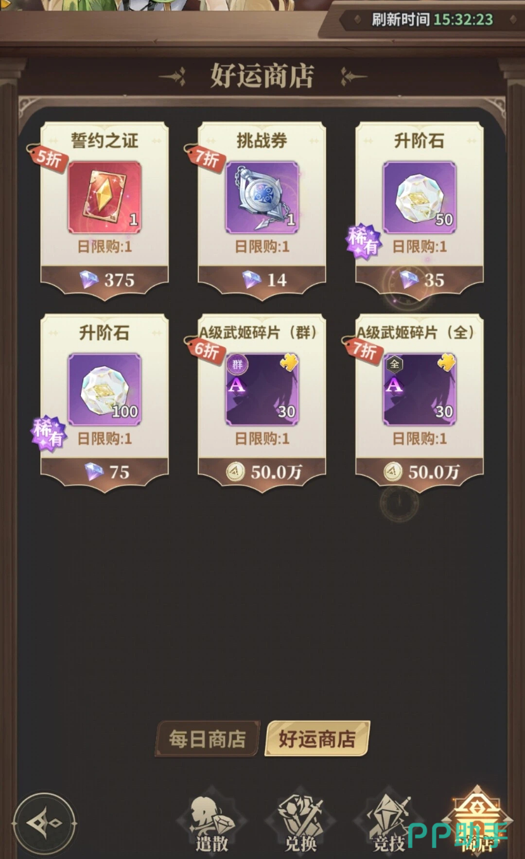 资源分配需遵循明确优先级。在杂货铺中,升阶石、誓约之证、群星之证为首选采购项——升阶石支撑武姬等级与星级双重成长;誓约之证与群星之证则专用于核心武姬抽卡及升星环节。公会商店内,武姬天启石应列为第一顺位兑换目标,因其获取渠道稀缺且为关键突破材料,直接影响后期战力上限。