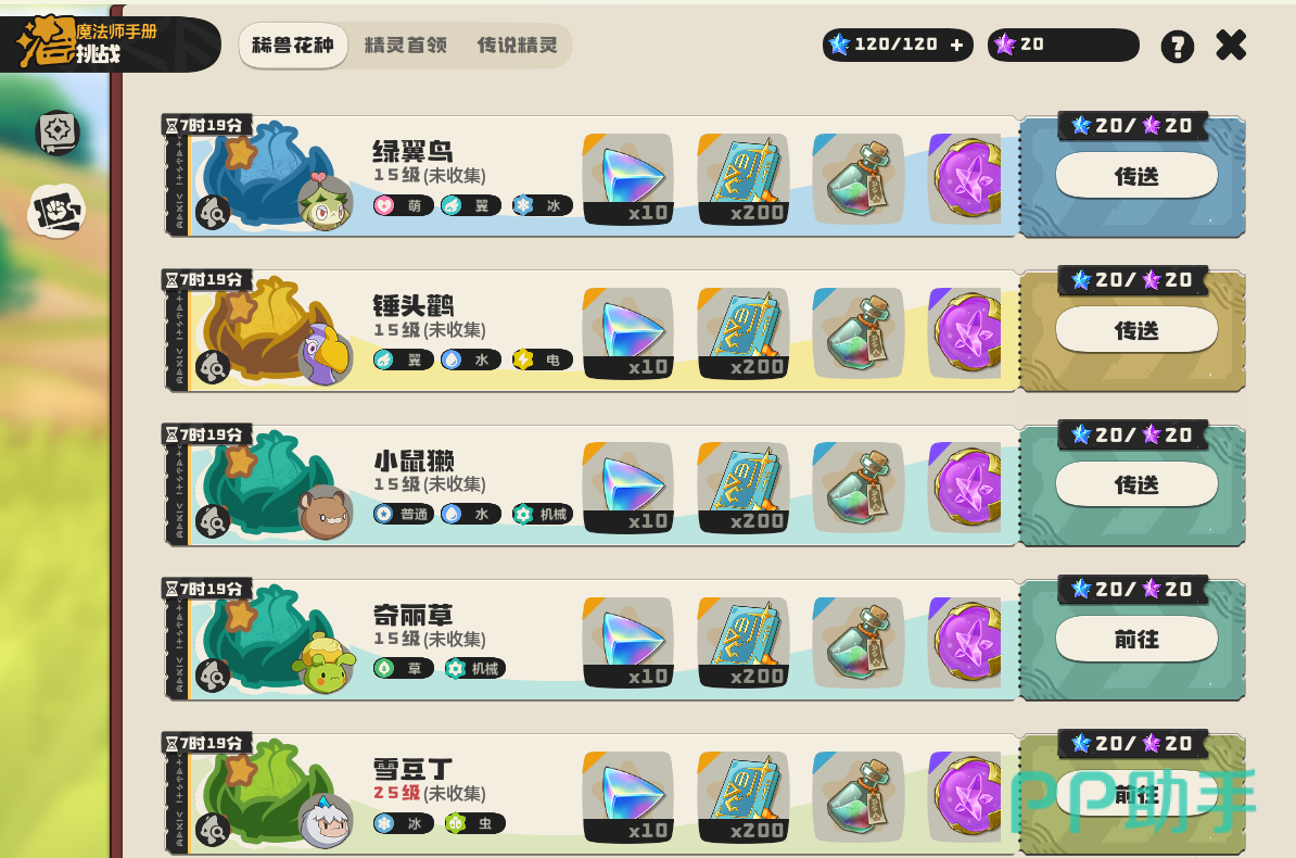 玩家在达到对应等级后,可进入“魔法师手册”中的“挑战”模块查看全部稀兽花种列表。该板块不仅完整罗列了所有稀兽花种名称及图鉴编号,还同步展示了精灵首领与传说精灵入口,支持一键传送至其所在地图坐标,大幅降低寻路成本。