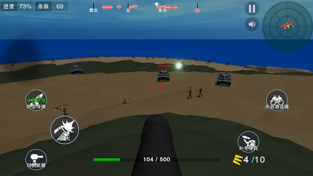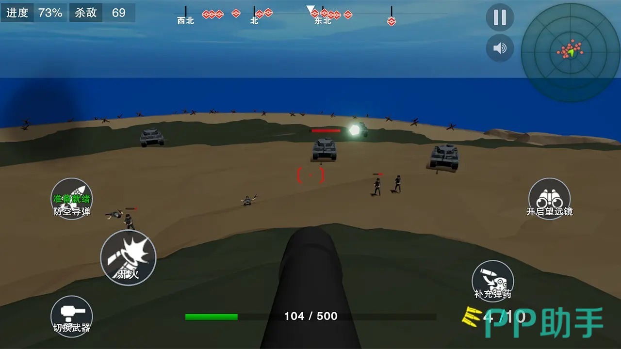 本作继承经典“抢滩登陆”玩法内核,强化3D视角与实时弹道反馈。玩家需驻守固定防御点,操作RPG火箭筒、高射炮、重机枪等多类重型武器,依据敌方单位移动轨迹、集群阵型及突袭方向,自主调整射击角度与火力分配节奏。AI敌人具备多波次、多路径、多形态(步兵/载具/空降)进攻逻辑,考验玩家资源调度与瞬时反应能力。