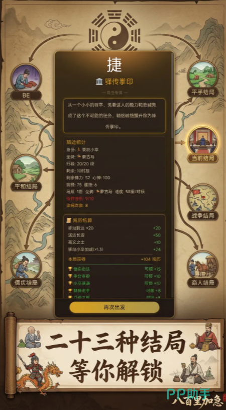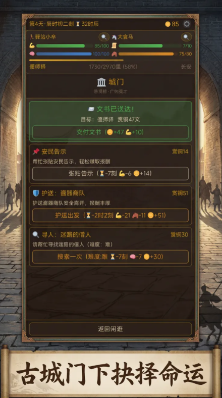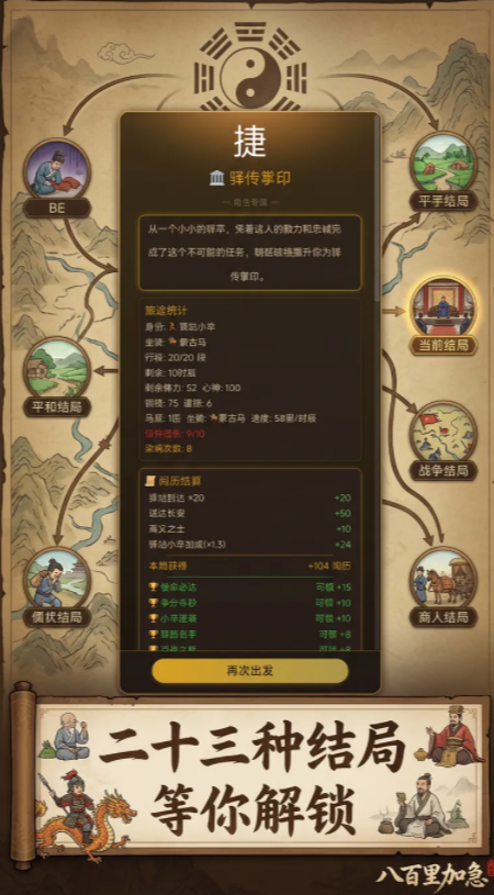 作为肉鸽游戏,玩家在送信过程中,会随机出现40多种不同的事件,每个事件根据玩家做出的选择不同,后续事件走向会发生变化,最终结局也会有所不同,里面总共会设定23种结局,其中15种都是胜利结局,代表玩家不管如何选择,都有极大的机会获得胜利,挑战过程中不需要刷怪升级,能在较强历史沉浸感的设定场景中,完成军机文书的运送。