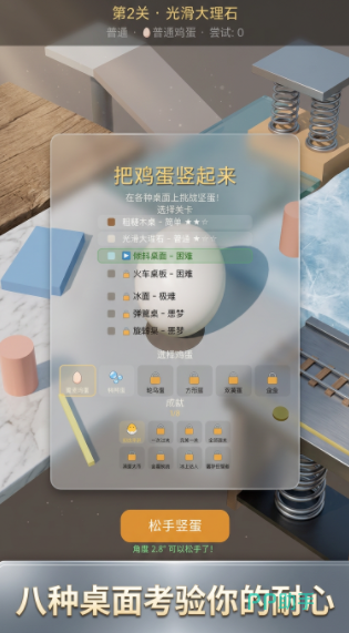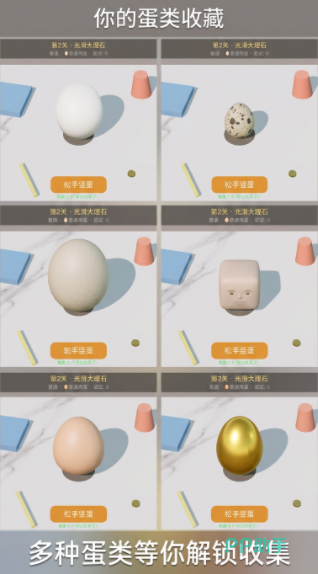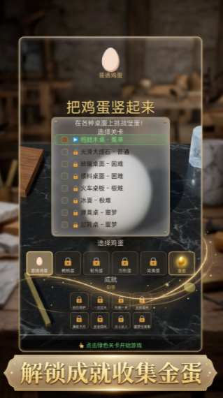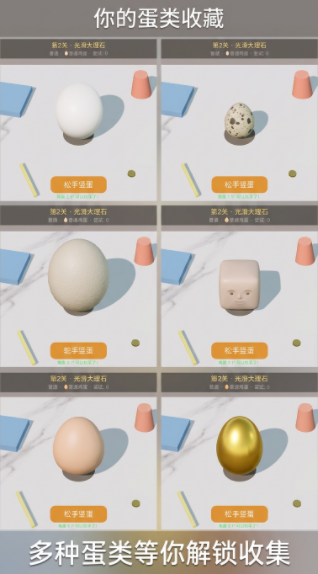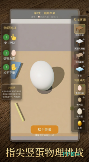 为了满足不同玩家的游戏需求,挑战开启之前,玩家可以选择相应的游戏难度,桌面材质不同,整体的难度也会有所区别,选择完难度之后,玩家还可以挑选鸡蛋种类,不同蛋的大小形状有所区别,挑战过程中的难度也会发生变化,可以根据自己的需求和喜好做出选择,开启不同的竖蛋挑战,每完成一次挑战之后都会记录下来玩家的操作时间,还可以直接把对应的蛋类收集起来。