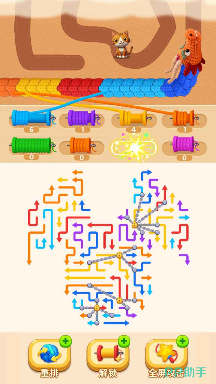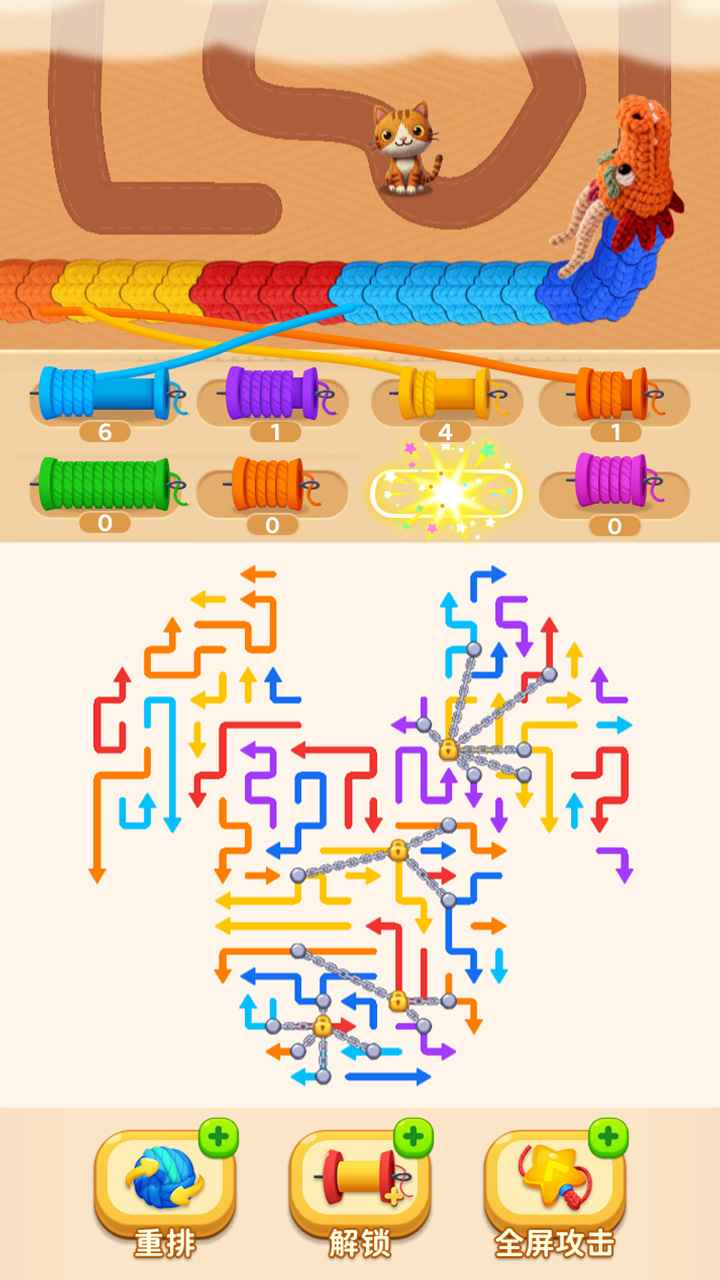 在箭头超解压中,玩家通过不断的滑动箭头来将原本处在复杂状态的箭头给一一捋顺,在这个期间,玩家可以通过不停的移动、调整箭头的方向感觉到游戏的解压内核所在,蛇阵中的所有箭头全都是能够转化成为弹药的存在,玩家捋顺的箭头越多,哪么获得的弹药数量也就越多,在调整箭头的同时,还会看到在屏幕上方有一只将会受到巨龙攻击的小猫咪,这条巨龙正在缓缓的向小猫咪逼近,为了解救小猫咪,玩家需要用更高效的方式来解谜,并且用对应颜色的弹药来攻击剧痛,削弱巨龙的战斗力才行。