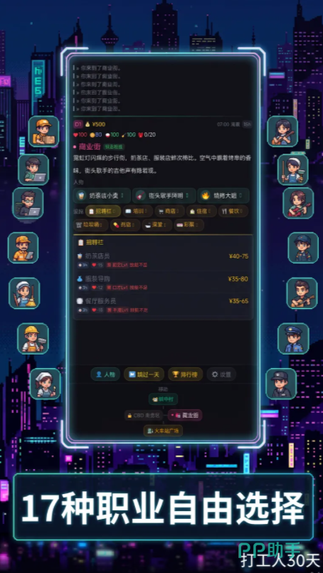 进入到打工人30天之后,玩家会来到一个陌生城市,城市中没有任何亲朋好友,玩家需要用仅剩的500元扎根城市,想让在城市里生存下去,需要先从最底层的工作开始,通过逐渐积攒资金学习技能,让角色能拥有更多生存能力,积累一定经验之后,玩家可以在游戏里跳槽,选择其他工作,可以逐渐从一个普通人成为白领,在此之前先要用500块钱解决基础的居住和生存,挑战过程中会发生大量的随机事件,随时都有可能遭遇骗子,被骗光所有资产,也会因为生病消耗大量资金,需要跟随游戏里设定的情况随机应变。