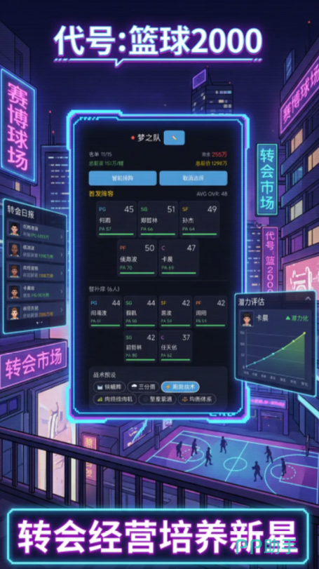 大部分篮球游戏都只是单纯对战,挑战过程中,主要考验玩家灵活的操作能力,代号篮球2000让每个成员都成为篮球经理人,以独特的身份开启策略对抗,作为篮球经理,玩家要去篮球比赛中招募心仪球员,通过给球员训练,提升角色的各项能力,球队达到足够的球员数量之后,将会以文字直播和数据对抗的方式,开启球场对抗,挑战比拼的不再是玩家个人的操作,会通过阵容搭配和战术一决胜负,成员都能来游戏里展现自身策略。