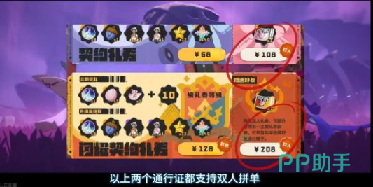 接着也可以来看一下通行证,通行证其实也会分成两个版本。单买还有拼单的价格还是会有一些区别的,大家可以选择找好友去拼接,能够节省更多的钱。如果是基础版本的契约礼单券,单买的话大概是68元,双人拼单的话一共是108元,人均只需要54元。此时就可以获得很多的奖励,例如240个愿望星,还有12张周本免体力券,以及两套紫色时装。基础的养成资源也会给的很足,日常刷副本或者是养精灵的需求也是可以满足。
