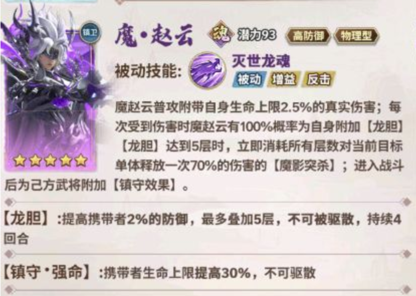 这套阵容的主要构造逻辑就是把反击的收益最大化。赵云和魔·赵云都是很容易获得且前期战斗力很强的武将,他们所具有的技能特点具有很强的反击能力。君主在布阵的时候要把这两位武将放在前面,以达到最大限度地提高他们发动反击的机会和次数的目的。前排站位既符合他们的高生存性,又可以利用敌人的攻击频率转化为我方的输出火力。该阵容采用以彼之道,还施彼身的战术,即使属性比对手低一些,角色也可以依靠频繁的反击来扭转局势。