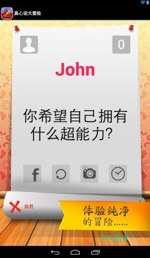 《无节操真心话大冒险》以紧紧的多人互动为驱动,通过各种非比寻常的题目,比如情感,隐私等等,玩家们轮流进行真心话的发言,去完成各种指定的冒险任务,游戏进行了非常人性化的选择系统,支持玩家们自选题目杜绝尴尬的出现,而且在回答的过程中,其他玩家是无法去插话打断的。