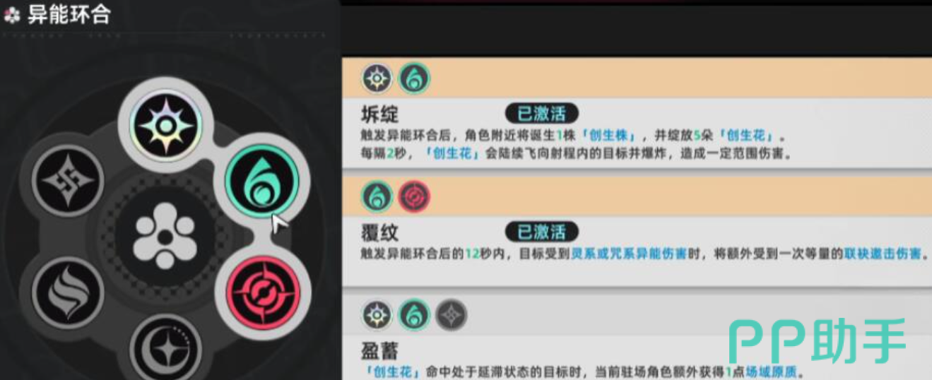 环合系数一旦处于满值的状态下,其实就能够触发异能环合,并且还能够解锁三种使用的效果,在这样的情况下,就直接能够把战斗优势拉满,对于玩家来说,他们这时候所打出来的伤害强度特别的高。覆纹则是在12秒之内就可以让敌人受到灵系或者是咒系的伤害,额外还会让等量的联袂邀击伤害,在这样的情况下,就能够直接让元素输出提升,主打的就是各个元素之间,其实也需要合理的配合。