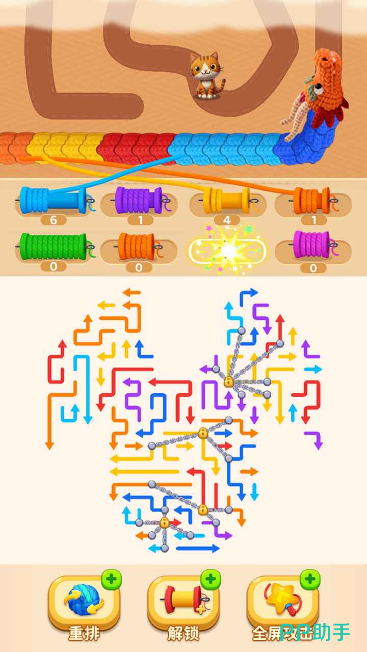 游戏中,玩家需在限定时间内完成箭头路径重组,并将其输出为弹药,用于拦截向猫咪方向移动的巨龙。屏幕底部设有4个固定线轴位,不同颜色的线团会依序从巨龙身上脱落,须按色归类至对应轴位。当现有位置不足时,可通过观看广告解锁额外线轴槽位——更多可用位置意味着更高的容错率与更稳定的输出节奏。