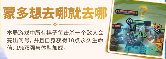 四、“想去哪就去哪”:本局中所有棋子每次击杀敌方单位后,自身图标显示问号标识,并永久获得10点生命值、1%双属性强化(攻击/法强)及体型成长效果。