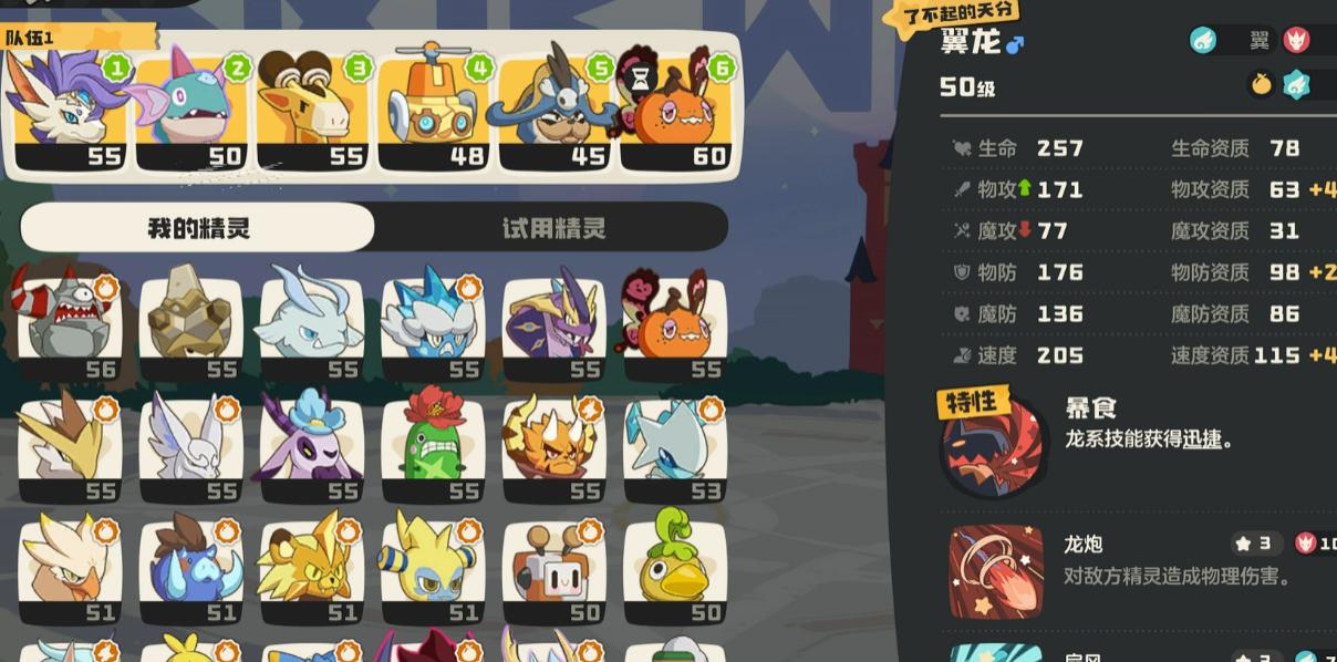 主打“属性滚雪球”机制,关键精灵为帅帅魔偶。其特性允许复制队友已使用的强化类技能,因此可在前排配置具备泥浆铠甲、吸血、攻击提升等增益效果的辅助精灵,通过多轮回合叠加状态,使魔偶在中期获得远超常规的成长收益。该体系在中后期具备极强的单点突破能力,部分场景下甚至可实现单精灵通关,对装备与星级依赖较低。