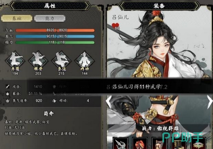 三门必修武学分别为:飞将戟法、百鸟朝凤枪、另一门未具名枪术。需特别注意,“百鸟朝凤枪”并非在谭城阶段开放,须先完成甘泉苦水支线(该支线位于谭城之后),方可习得。建议优先安排吕仙儿前往甘泉苦水区域完成对应任务,获取该枪法后再集中资源提升等级。