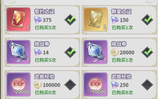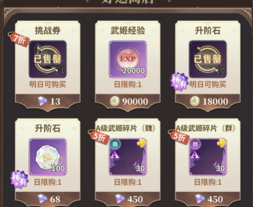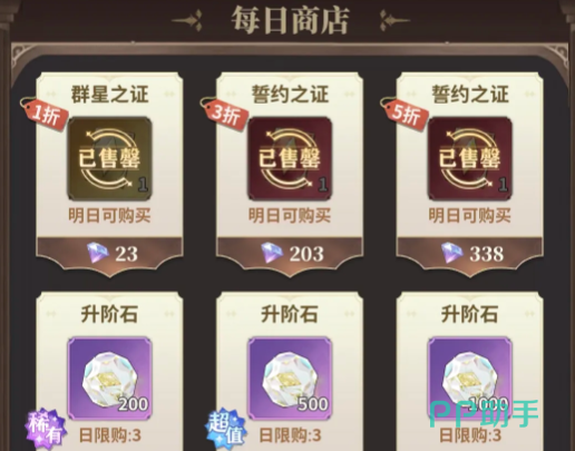 日常商店就是基础,每日商店里面的群星之证一折,誓约之证三折以内必秒。另外,升阶石就需要按照需求去拿,挑战券7折也可以囤。前中期的钻石比较充裕,好运商店一定要每天刷满。抽卡道具,还有角色的碎片,就需要优先去购买。金币后期爬塔根本就用不完,可以直接忽略,四星狗粮相对就会比较稀缺,所以看到之后一定要拿。开服钻石少的话就先只购买每日,不要乱抽卡。