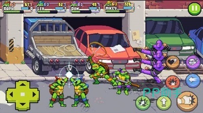 《忍者神龟施莱德的复仇》分别围绕着老鼠师傅被绑架以及反派施莱德,游戏进行了双故事线模式的设计,而且在走剧情进行关卡战斗的同时,游戏会把核心的情节以反派进行对话的形式向我们讲解,4个忍者龟,4种特性分明的外貌以及技能特征打造,关关我们都要迎战三个阶段的敌人出场。